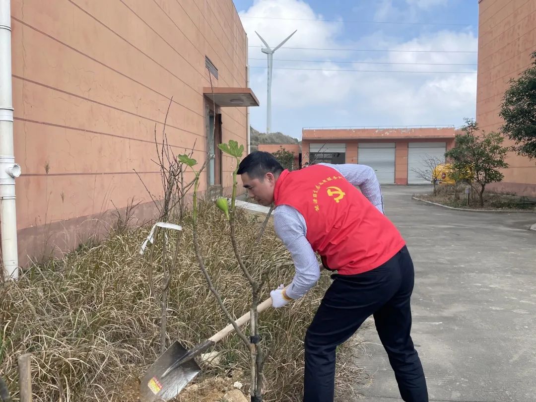 線下,能源公司的黨工團志愿者們帶上樹苗、扛起鋤頭,奔赴平陽西灣及蒼南霞關(guān)兩個風電場,在暖陽下,挖坑、栽樹、壓土、澆水...... 各個環(huán)節(jié)銜接有序,配合默契,認真地完成每一道工序,一棵棵新苗就穩(wěn)穩(wěn)地在土里扎下了根,為風電場的春天又增添了一抹新綠。