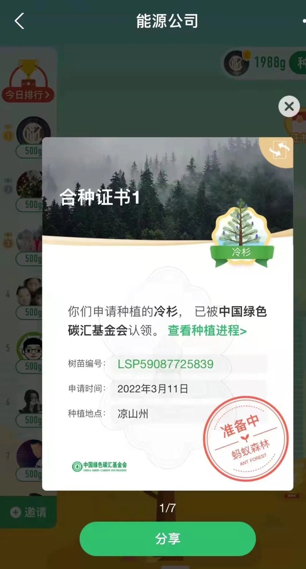 “一花一草皆生命,一枝一葉總關(guān)情?!痹缭?019年起,公司就通過支付寶螞蟻森林組建了一只“能源公司云種樹小隊”,如今隊伍人數(shù)越來越壯大,已有59位隊員,截止目前,在酒泉、大理、邯鄲等地,種下了冷杉、側(cè)柏、云杉、胡楊等7棵大樹。3月11日,在小伙伴的共同努力下,我們又種下了一棵冷杉樹,該樹被中國綠色碳匯基金會認領,將種植到?jīng)錾街莸貐^(qū)。